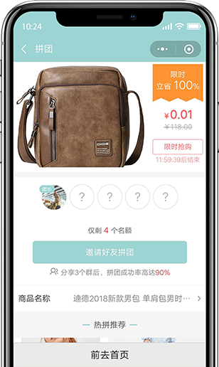 微拼團(tuán)是商品營銷和售賣的一種方式,通過社交關(guān)系鏈分享傳播,可自由設(shè)置開團(tuán)人數(shù),開團(tuán)價格。用戶在分享時,小程序上實(shí)時顯示當(dāng)前的拼團(tuán)信息,比如已經(jīng)有多少人參與,價格是多少等。