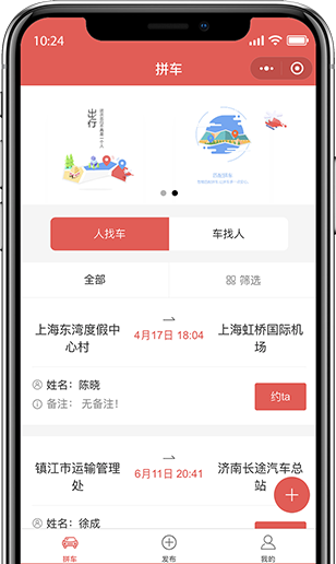 拼車模塊分車找人和人找車兩種模式,進(jìn)入小程序后用戶只需要輸入自己的具體位置和目的地,將信息進(jìn)行提交后,小程序會將發(fā)布信息上傳至平臺,尋找相匹配的私家車或者乘客。